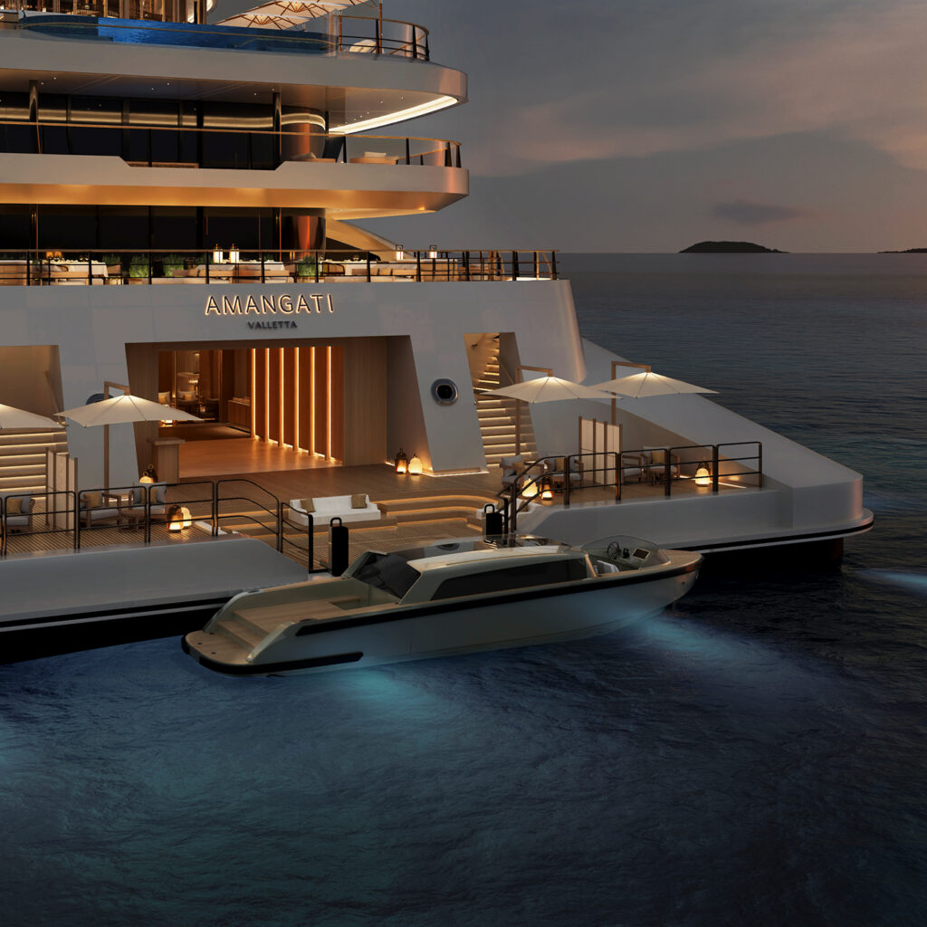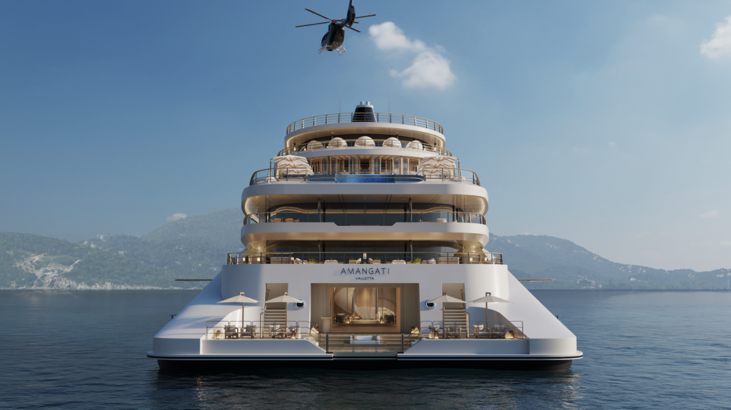 Actuellement en construction, l’Amangati est un yacht de 180 mètres de long répartis sur neuf ponts. Pensé pour incarner les valeurs emblématiques fondatrices d’Aman — espace, intimité et sérénité — il entend établir un nouveau standard dans le design maritime de luxe. Le navire accueillera un maximum de 94 passagers, logés dans 47 suites allant de 68 à 354 mètres carrés, toutes dotées d’une terrasse privée, offrant ainsi une générosité d’espace de vie particulièrement rare en mer.