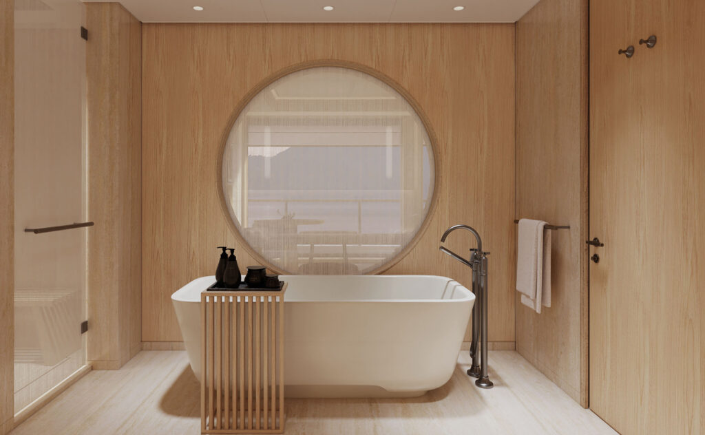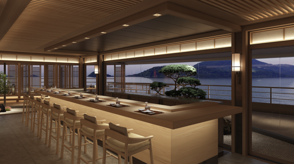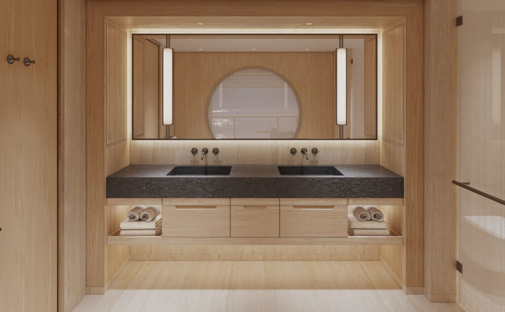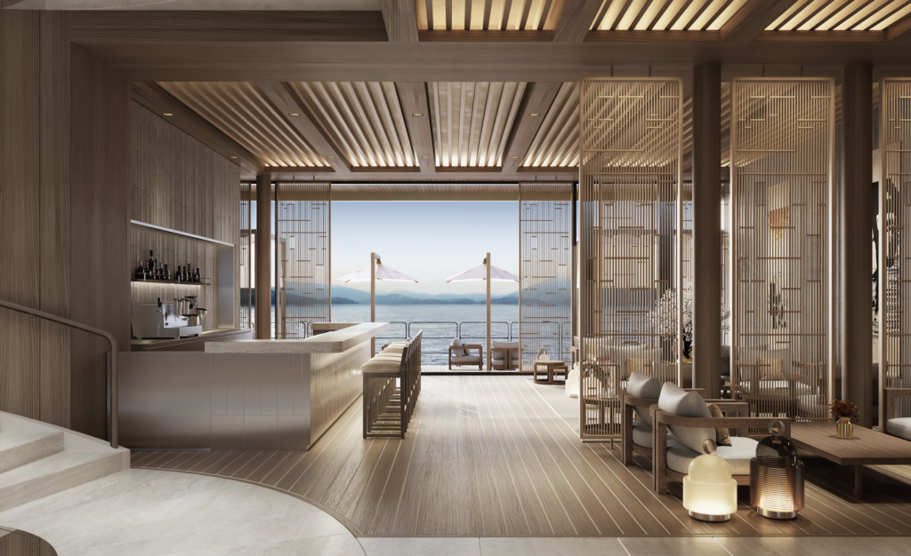 Les intérieurs s’inspirent de la sobriété raffinée des ryokans japonais, avec de vastes baies vitrées sur toute leur hauteur et des terrasses privées omniprésentes, garantissant luminosité, espace et une connexion permanente avec l’environnement marin.