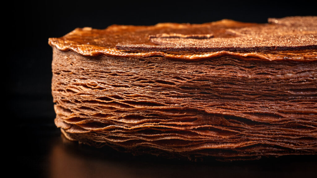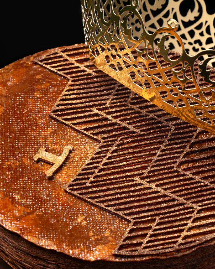 La galette associe une pâte feuilletée au cacao à une généreuse frangipane à la châtaigne, rehaussée de délicates notes de noisettes, pour créer une expérience gustative riche et complexe. De la pâte feuilletée infusée au cacao à la crème goût châtaigne, en passant par le praliné aux noisettes, les éclats de cacao et la tuile au cacao dorée, chaque élément est composé avec une précision méticuleuse. Cette attention portée à la structure, à l’équilibre et aux détails fait écho aux valeurs de la Haute Horlogerie, où la maîtrise du temps s’exprime à travers un savoir-faire rigoureux et des proportions harmonieuses.