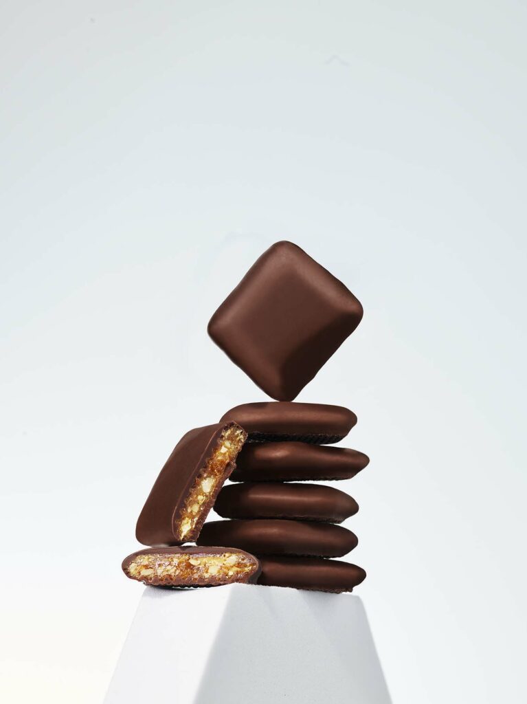 Carrés de nougatine enrobés de chocolat offrent un contraste d’une immense gourmandise entre le croquant caramélisé de la nougatine et la volupté puissant du chocolat.