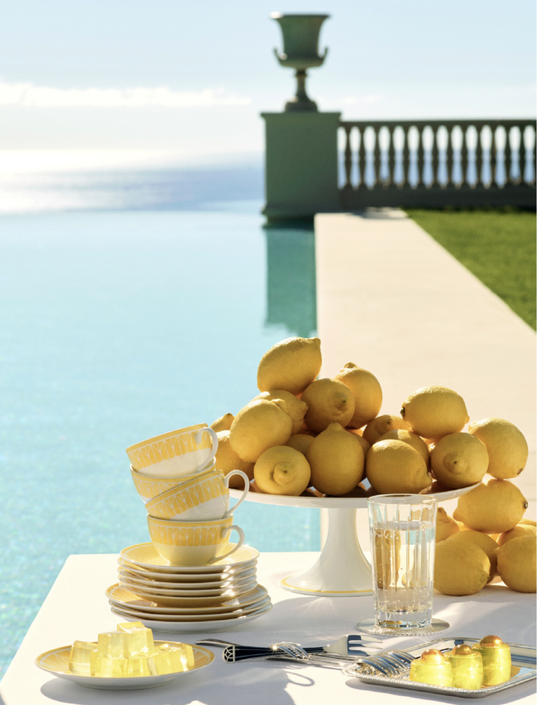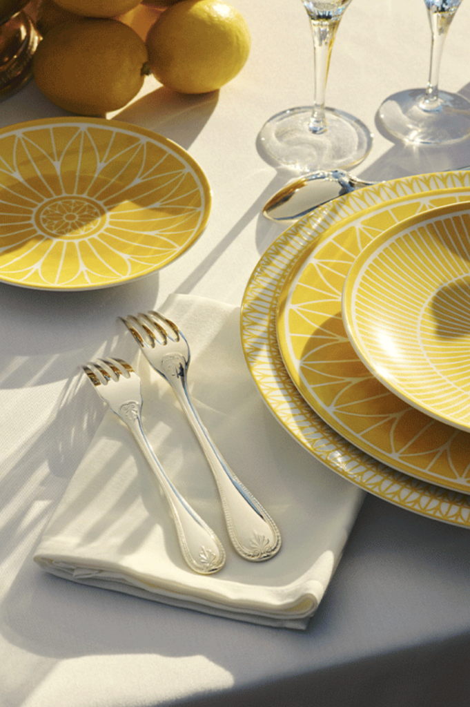 « Chaque pièce du service malmaison riviera semble capturer le soleil méditerranéen, grâce à un délicat jaune aquarellé, vibrant et naturel, venant réchauffer et illuminer la table ».