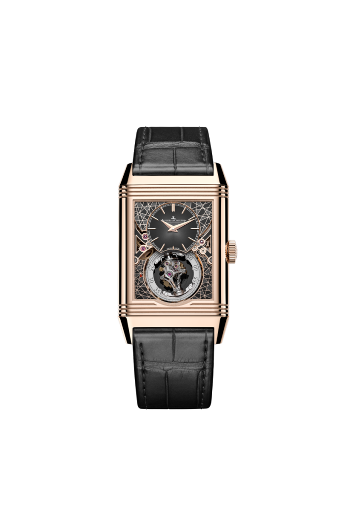 Sur le cadran avant, en référence subtile aux motifs géométriques Art déco qui ont déterminé le design original de la Reverso, les platines décoratives et les ponts présentent un treillis de fines lignes assorties à la couleur du boîtier en métal précieux. Ces lignes sont en fait des nervures ultrafines de la platine en or rose, qui sont apparues lorsque la surface a été creusée au laser pour créer les 200 cavités qui contiennent la laque. Les laques noires et grises ont été habilement appliquées à la main entre les nervures métalliques afin d’obtenir la richesse des couleurs et la profondeur souhaitées ; la surface est ensuite polie à la main pour obtenir un fini brillant parfaitement aligné avec les nervures.